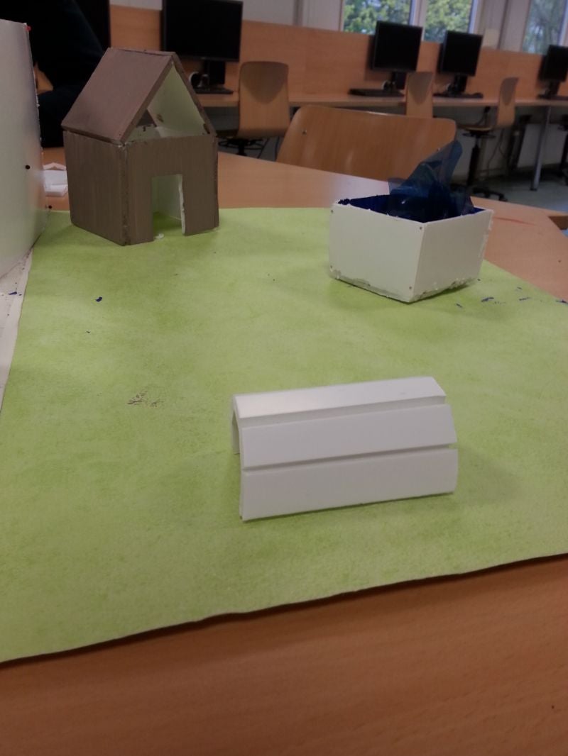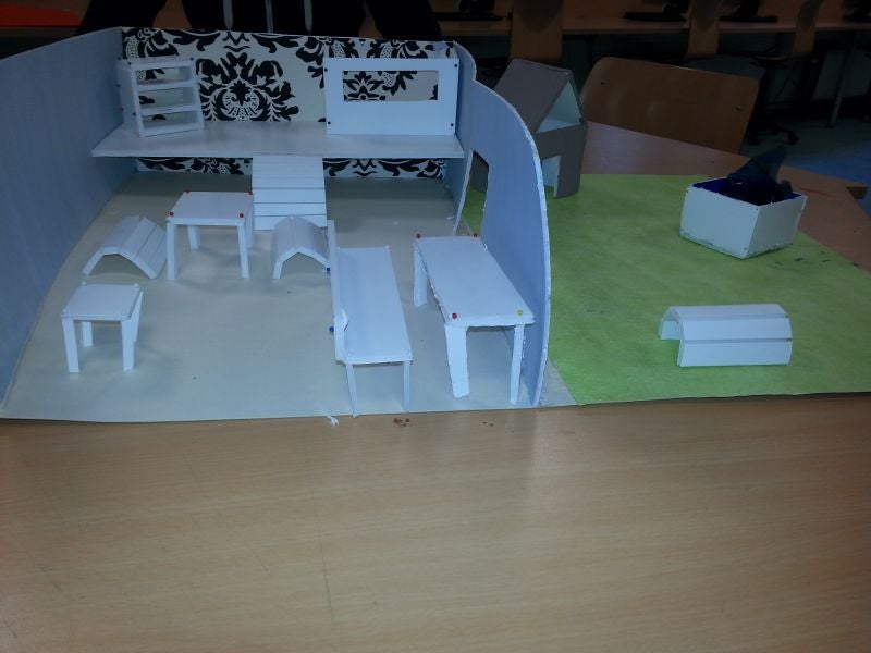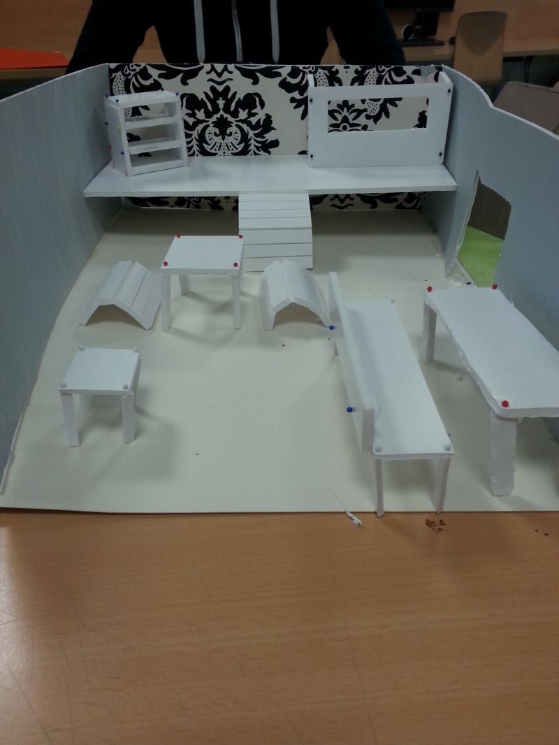 Wij hebben onze maquette opgedeeld in een deel buiten en een deel binnen die verbonden waren met elkaar door een grote deur. Binnen hebben wij vooral een beetje de aula of studeerlokaal van gemaakt en buiten hebben wij een overdekt huisje een jacuzzi en een aantal bankjes neergezet.